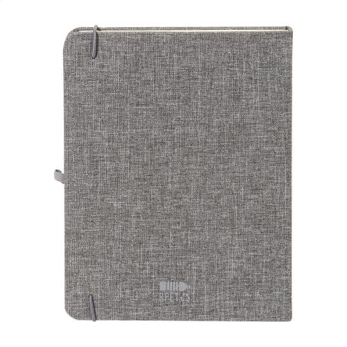 300D RPET polyester covered notebook with 80 blank sheets. With matching colour rubber strap, bookmark and pen holder. A5 size.