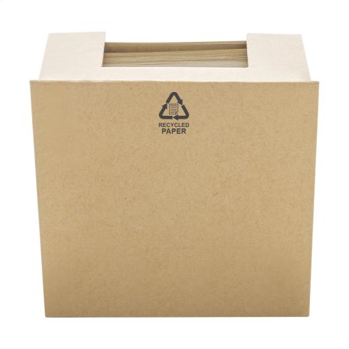 House shaped, recycled cardboard note dispenser with 300 sheets recycled kraft paper memo block. Including 25 yellow sticky notes and 100 page markers (in 4 colours) on the top.