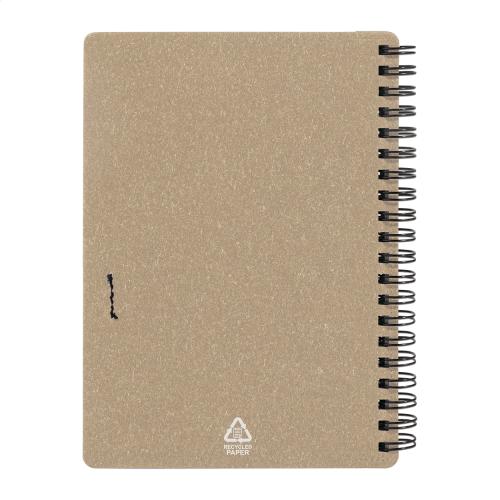 Recycled paper spiral notebook with 80 lined sheets. A6 size. Including recycled paper and recycled PP ballpoint pen with blue refill.