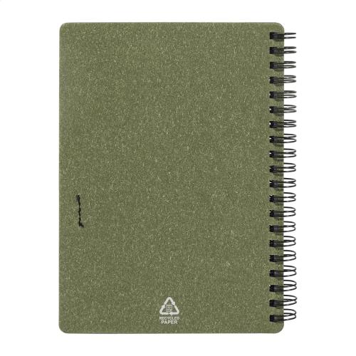 Recycled paper spiral notebook with 80 lined sheets. A6 size. Including recycled paper and recycled PP ballpoint pen with blue refill.