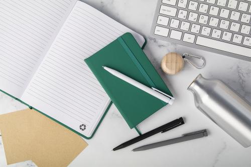 Recycled PU leather covered notebook with 100 lined sheets in recycled paper. With matching colour bookmark and rubber band. A6 size.
