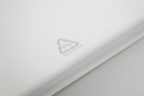 Recycled PU leather covered notebook with 100 blank sheets in recycled paper. With matching colour bookmark and rubber band. A5 size.