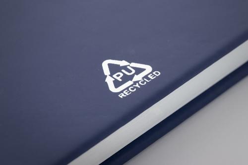 Recycled PU leather covered notebook with 100 blank sheets in recycled paper. With matching colour bookmark and rubber band. A6 size.