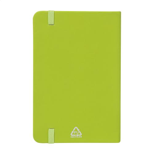 Recycled PU leather covered notebook with 100 blank sheets in recycled paper. With matching colour bookmark and rubber band. A6 size.