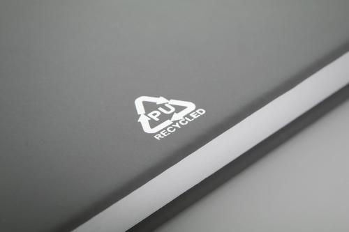 Recycled PU leather covered notebook with 100 blank sheets in recycled paper. With matching colour bookmark and rubber band. A6 size.