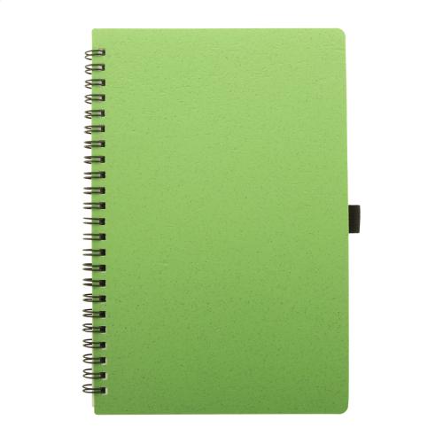 Ecological wheat straw plastic covered spiral notebook with 70 lined sheets in recycled paper and pen holder, A5 size.