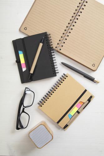 Recycled paper spiral notebook with 70 lined sheets and 125 page markers (in 5 different colours). With rubber strap and pen holder. A6 size. Including recycled paper ballpoint pen with blue refill.