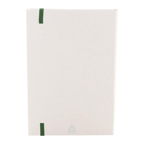Recycled milk carton paper notebook with hard cover, 80 lined sheets and matching colour elastic band. A5 size.