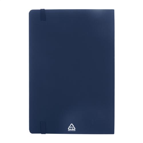 Recycled PU leather, soft cover notebook with 80 lined sheets in recycled paper. With matching colour bookmark and rubber band. A5 size.
