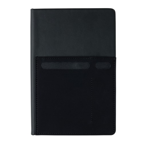 A5 notebook with 160 cream coloured lined pages of 80g/m2 paper inside. Front cover has a flexible phone pocket, pen pocket and larger sleeve pocket for documents. Phone pocket is 8cm wide which fits iPhone 7 plus.