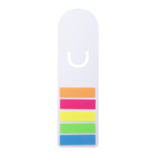 Custom made, paper bookmark with page markers. Includes 100 plastic film page markers in 5 assorted colours (44×12 mm). Price includes full colour printing on front side. MOQ: 100 pcs.
