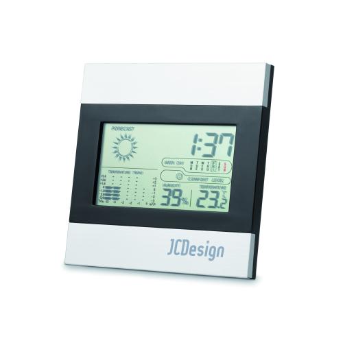 Black and silver weather station. Includes a clock, temperature humidity display and calendar. 2 AAA batteries not included.