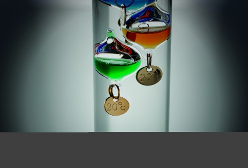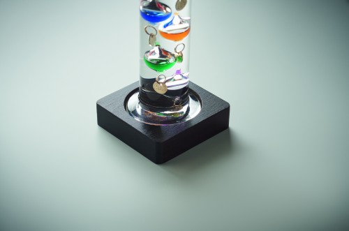 Galileo thermometer in glass with five coloured floating globes and wooden base. Each globe indicates the temperature from 18°c to 26°: Red 26°, Royal Blue 24°, Orange 22°, Green 20°and Purple 18°. The lowest sphere in the top group indicates ambient temperature.