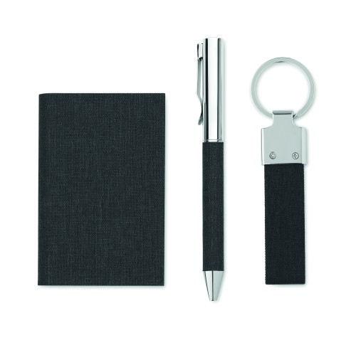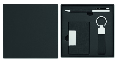 3 piece gift set in gift box. Including metal twist ball pen with RPET polyester detail, RPET polyester key ring and RPET polyester cardholder with metal plate. Blue ink.