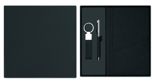 3 piece gift set in gift box. Including metal twist ball pen with RPET polyester detail, RPET hard cover notebook with front smartphone pocket, and RPET polyester keyring. Blue ink. FSC MIX CREDIT | P7.1 | FSC- C213206