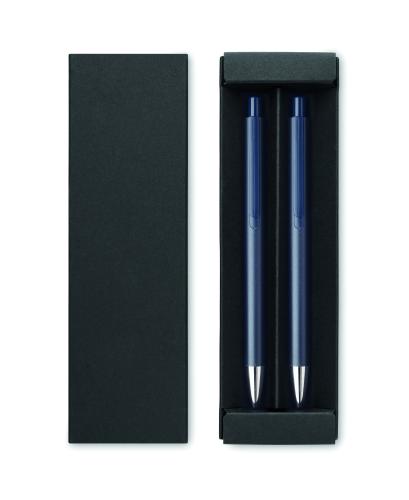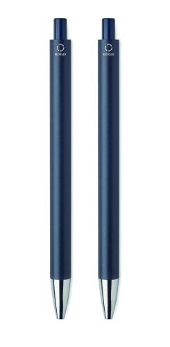 Recycled aluminium pen set with 1 push button ball pen and 1 graphite inkless pen. Blue ink. Presented in recycled paper box.