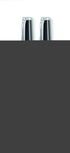Set of twist ball pen and roller in recycled stainless steel barrel. Blue and black ink respectively. Presented in gift box.