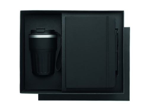 A5 notebook, recycled aluminium ballpen, and 350 ml double wall recycled stainless steel tumbler with PP sip lid and strap in gift box.