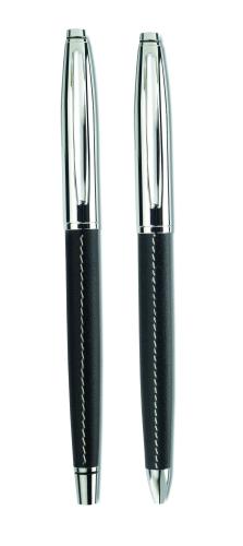 Metal pen set with ball pen and roller ball, presented in a zipped PU leather pouch in matching colour and contrasted stitching. Blue and black ink respectively.