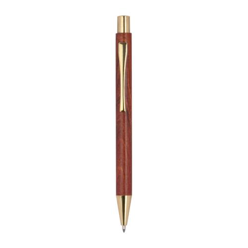 Ballpen with push mechanism and wooden coating, blue-writing big refill and golden applications.