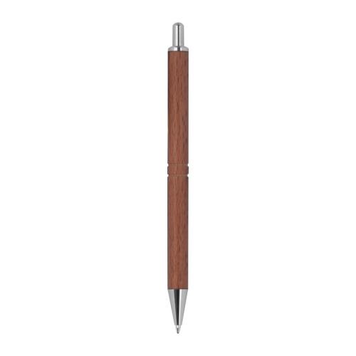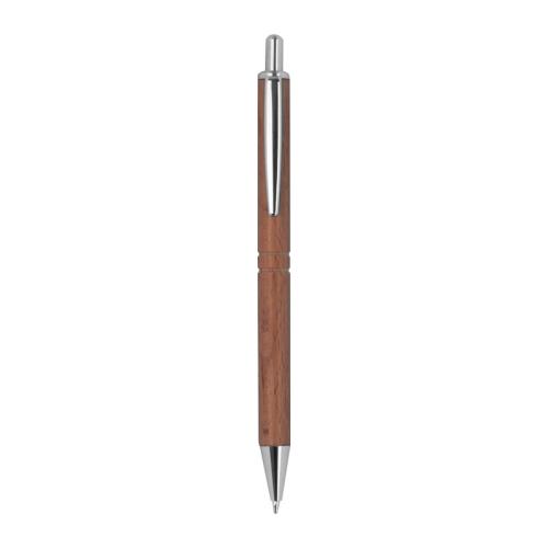 Wooden ballpoint pen with a blue refill, silver applications and two notches arround the barrel.
