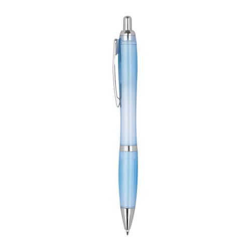 Classic ballpoint pen made of RPET, transparent with silver applications, rubber sleeve and large-capacity blue refill.