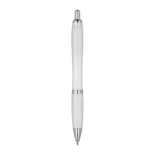 Classic ballpoint pen made of RPET, transparent with silver applications, rubber sleeve and large-capacity blue refill.