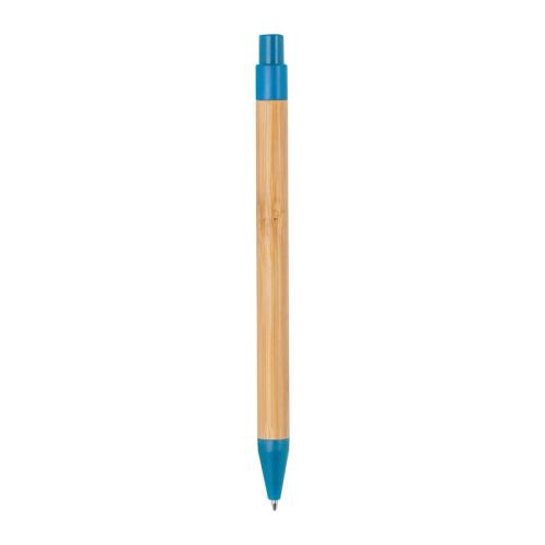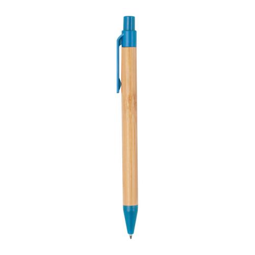 Retractable bamboo ballpen with coloured wheatstraw applications and a blue-writing refill.