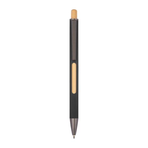 Recycled aluminium ballpen with black metal clip, blue refill, bamboo pusher and bamboo window at the height of the clip.