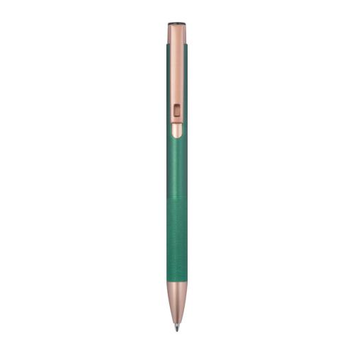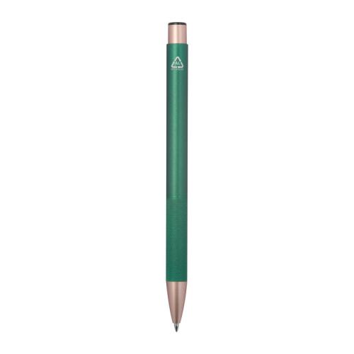 Ballpoint pen made of recycled aluminum with a matte finish and rose gold accents, equipped with a blue-writing large-capacity refill and a diamond-patterned grip zone.