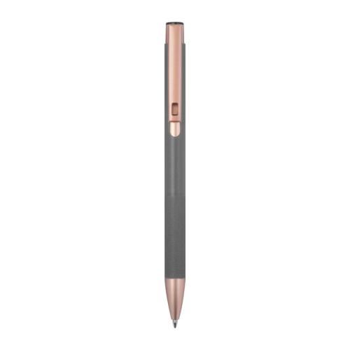 Ballpoint pen made of recycled aluminum with a matte finish and rose gold accents, equipped with a blue-writing large-capacity refill and a diamond-patterned grip zone.