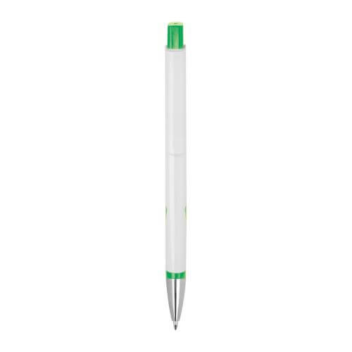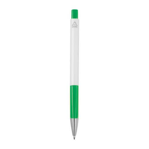 White ballpoint pen made from recycled plastic (RABS) with blue ink refill.