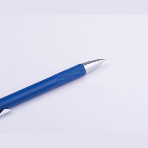 Ballpoint pen made from recycled aluminum with patterned grip zone, push mechanism, and blue ink.
