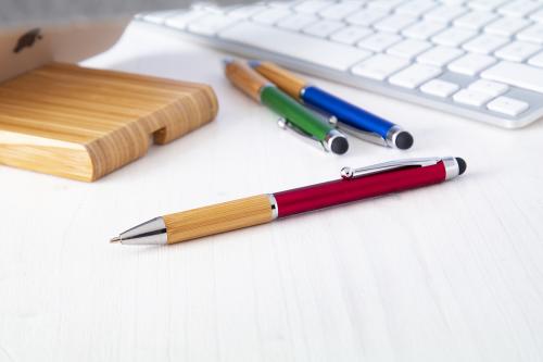 Plastic twist ballpoint and touch screen pen with bamboo grip, metallic finish barrel and shiny chrome parts. With blue refill.