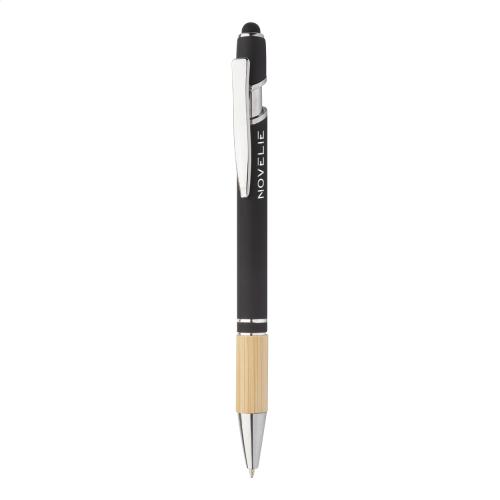 Aluminium ballpoint and touch screen pen with bamboo grip and rubberized finish. With special coating for mirror laser engraving. With blue refill.