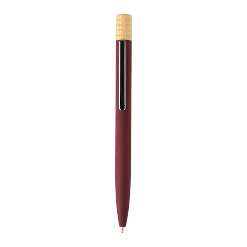 Recycled aluminium twist ballpoint pen with gunmetal finish clip and bamboo top. With blue refill. In kraft paper box.