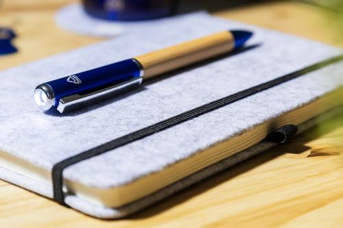 Bamboo and recycled ABS plastic, twist ballpoint pen with 1 LED flashlight. With blue refill and button cell battery.