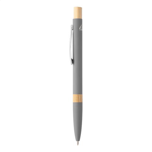 Recycled aluminium ballpoint pen with bamboo parts, rubberized finish and chrome clip. With special coating for mirror laser engraving. With blue refill.