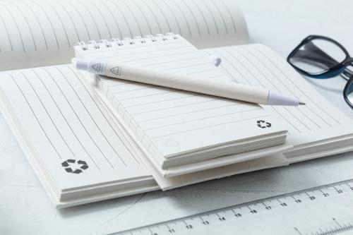 Recycled milk carton paper ballpoint pen with recycled ABS plastic parts. With blue refill.