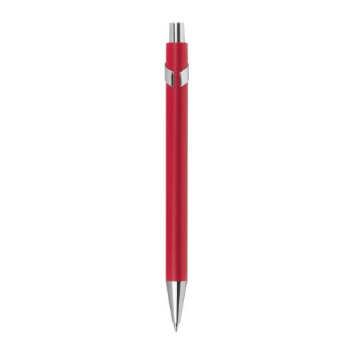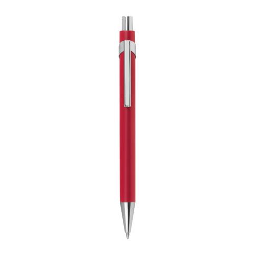 Metal ball pen in different colours, with silver applications and blue-writing refill.