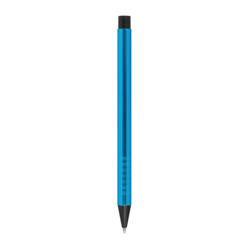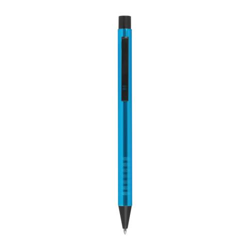 Metal ballpoint pen with blue-writing refill and fancy grip zone.
