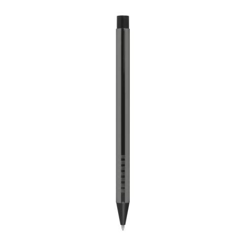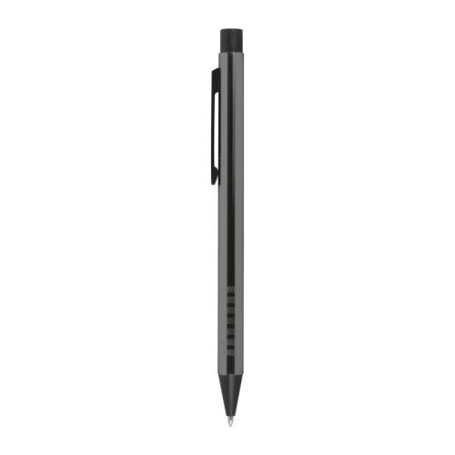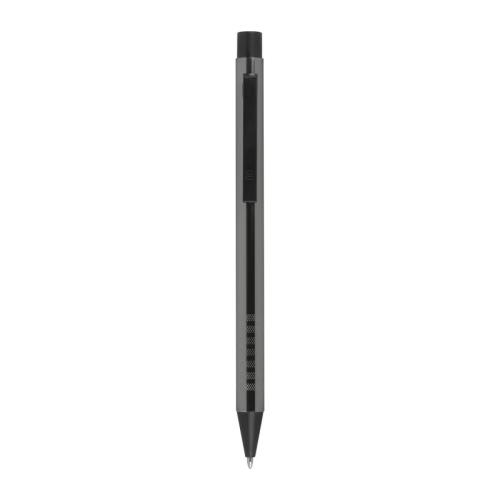 Metal ballpoint pen with blue-writing refill and fancy grip zone.
