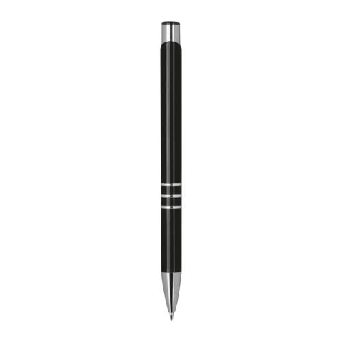 Fully lacquered metal ball pen with 3 decorative rings and blue-writing refill with large capacity.