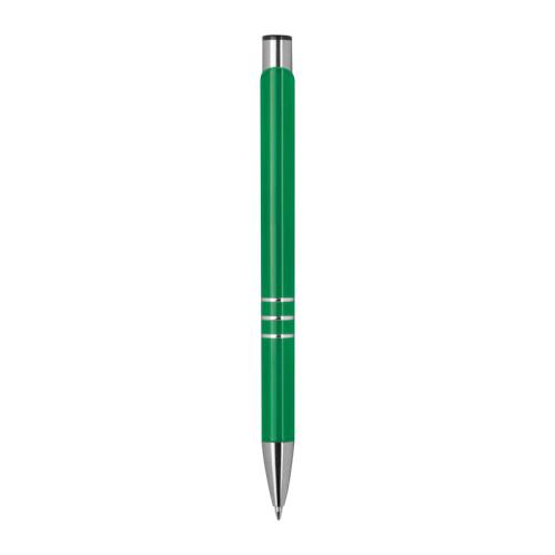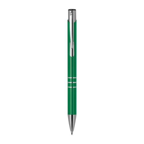 Fully lacquered metal ball pen with 3 decorative rings and blue-writing refill with large capacity.