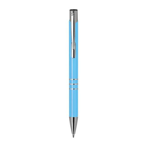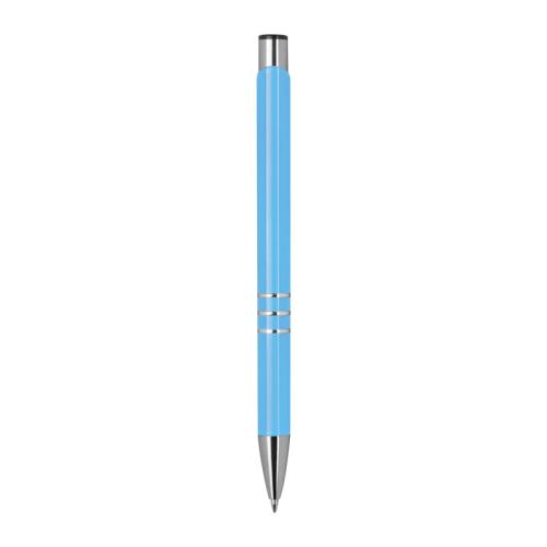 Fully lacquered metal ball pen with 3 decorative rings and blue-writing refill with large capacity.
