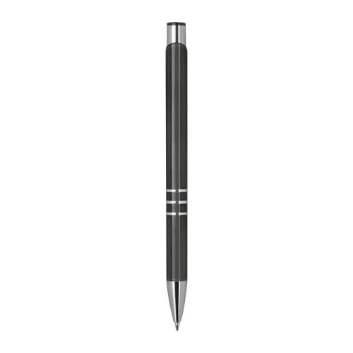 Fully lacquered metal ball pen with 3 decorative rings and blue-writing refill with large capacity.