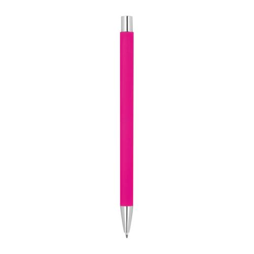 Slim metal retractable ball pen with silver applications and blue-writing refill.