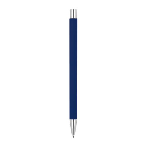 Slim metal retractable ball pen with silver applications and blue-writing refill.