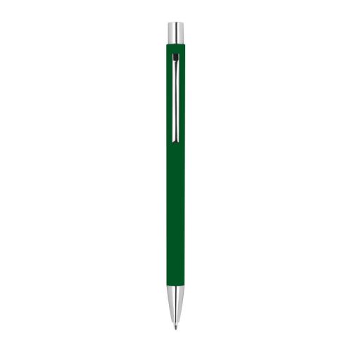 Slim metal retractable ball pen with silver applications and blue-writing refill.