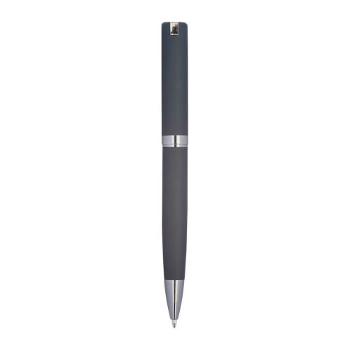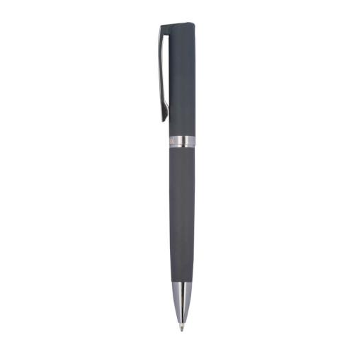 Twist action ball pen made of metal and rubberised surface in a classic design with a large capacity refill that writes in blue. The biros is supplied in a black case.